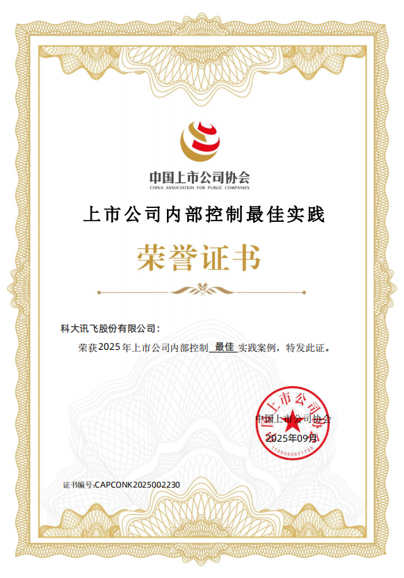 日前,由中国上市公司协会主办的“2025年中国上市公司内部控制最佳实践案例”评选结果正式揭晓,科大讯飞(002230)获评“内部控制最佳实践案例”。